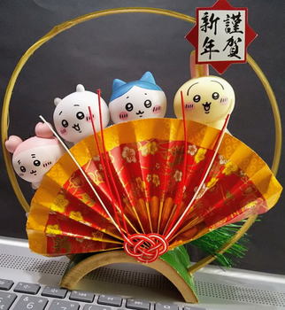 年賀のグリーティングカードありがとうございました。 100円ショップでソフビ人形と 置き飾りを買って組み合わせてみました。 今年もよろしくお願いします。